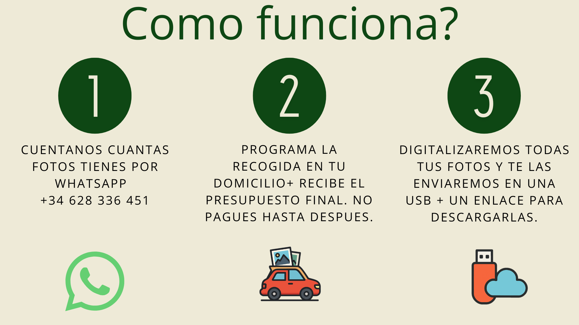Primero, utiliza nuestra calculadora para ver cuánto te costará digitalizar todas tus fotos. Cobramos una tarifa fija de solo 0,25 € por fotografía, hasta tamaños A4. Después, nos contactas por WhatsApp o por teléfono, acordamos una fecha y hora para ir a contar tus fotos, te damos un presupuesto y, si lo aceptas, llevamos las fotos a nuestro laboratorio para digitalizarlas. Luego te las devolvemos lo antes posible (o las desechamos si no quieres conservar las copias en papel) y te entregamos todos tus archivos en un USB más un enlace para descargarlos. Y voilà: ahora puedes disfrutar tus preciosos recuerdos en todos tus dispositivos digitales. Y es sin riesgo, siempre pagas despues la obra.